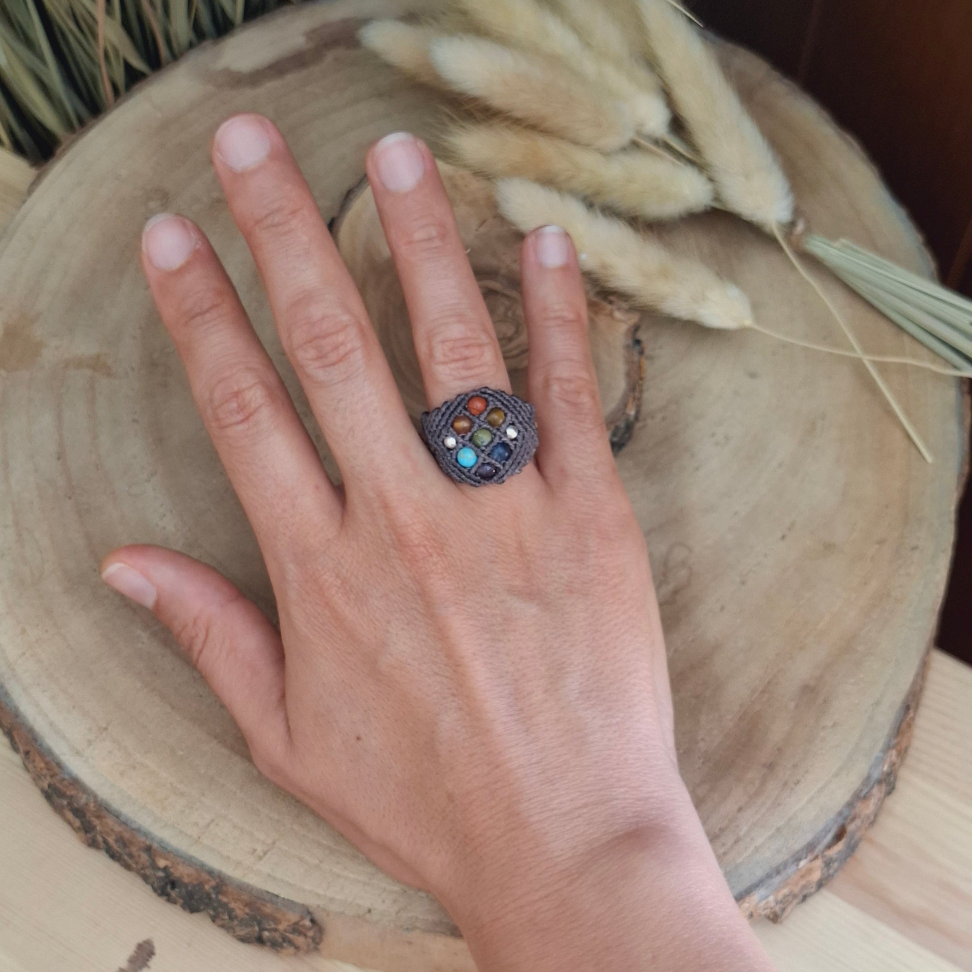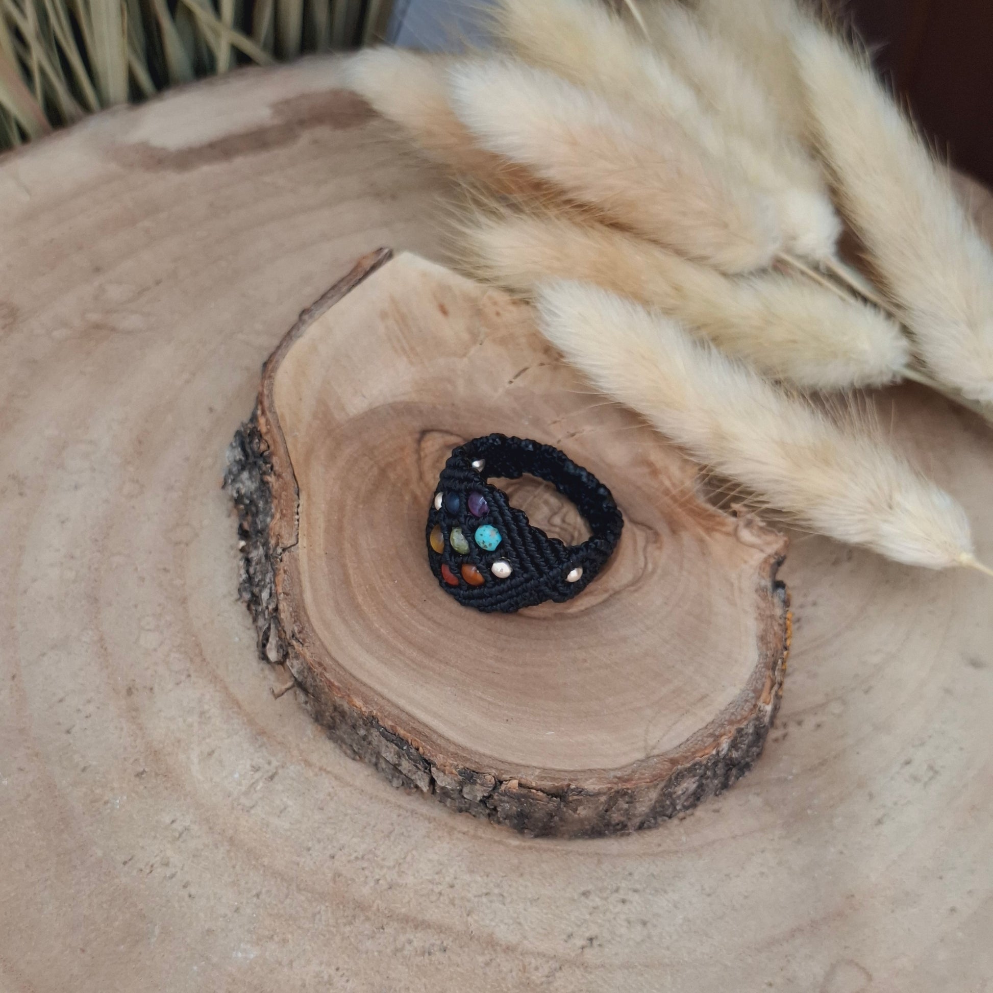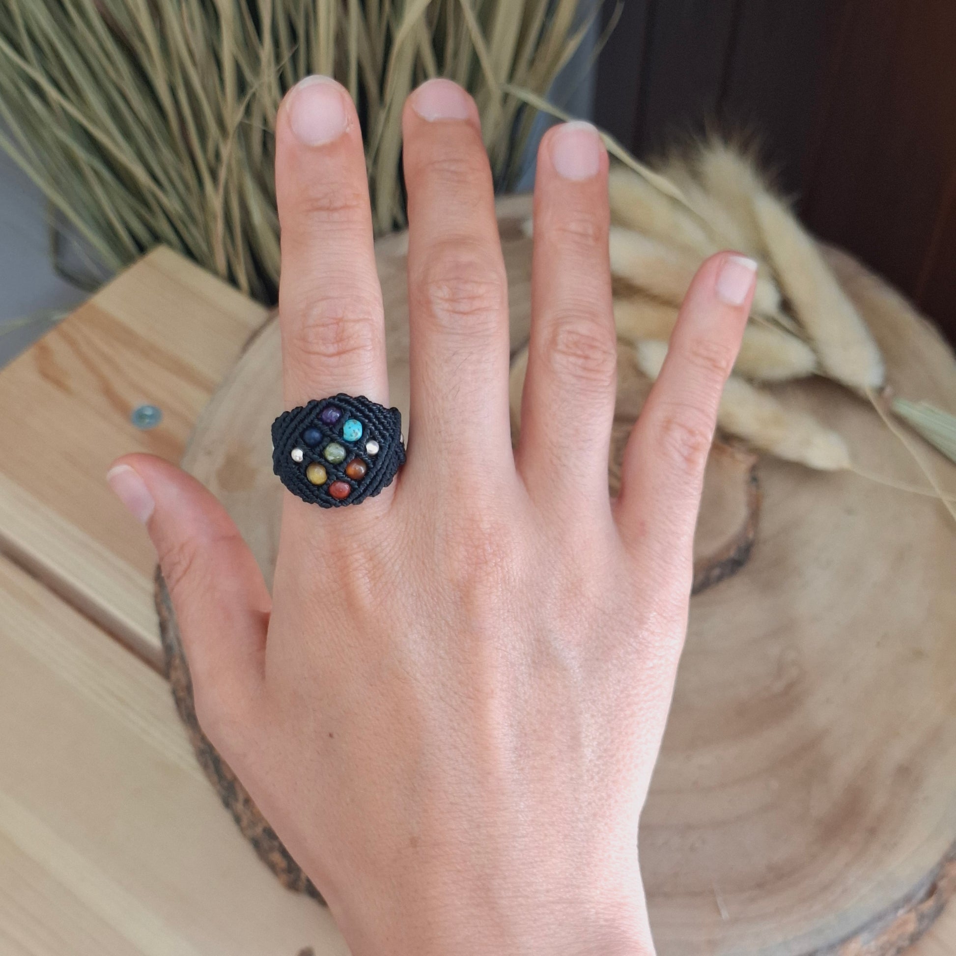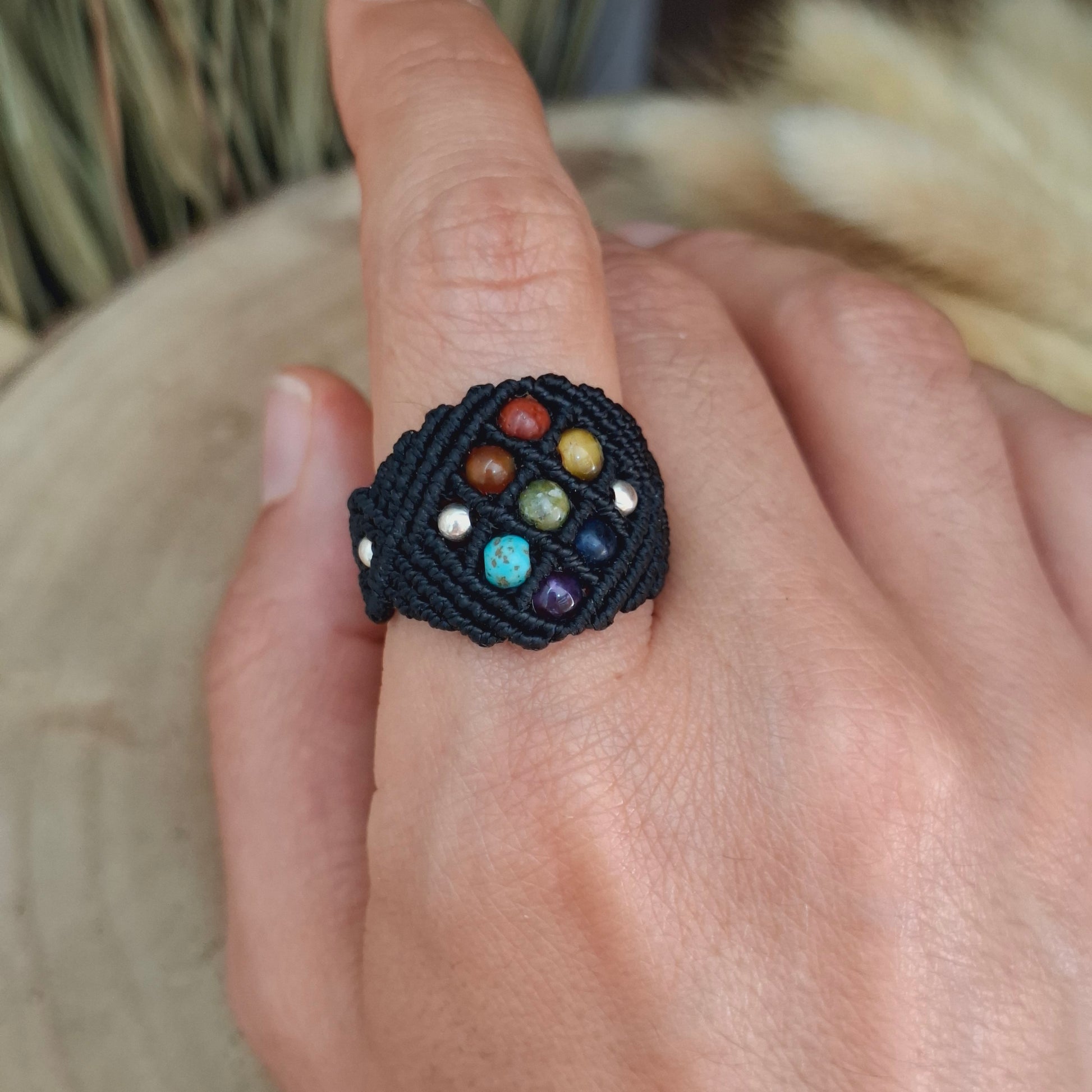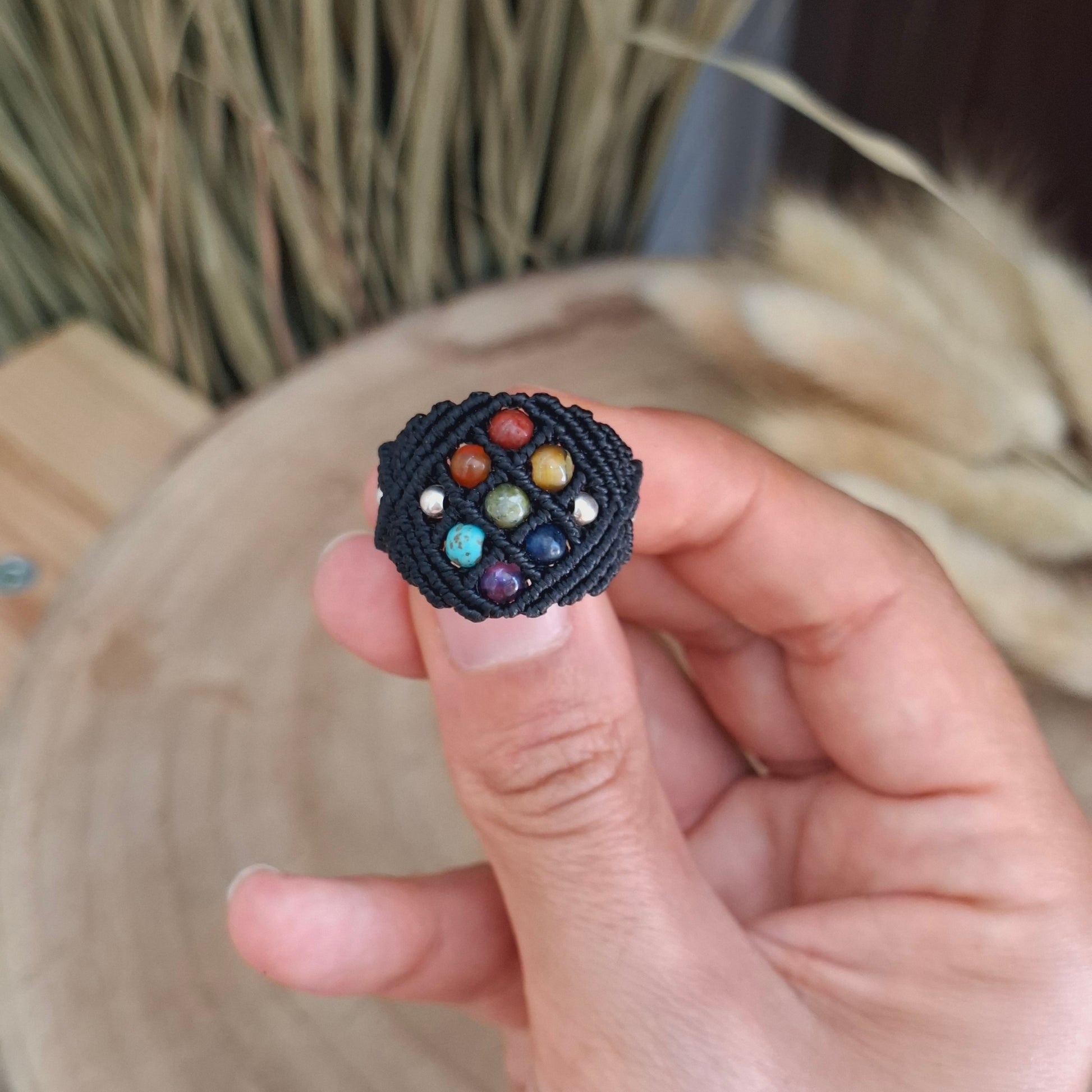- Anillo de macramé con los minerales de los 7 chakras. Hechos por encargo, los minerales pueden presentar diferencias de color y tamaño dado que son elementos naturales.