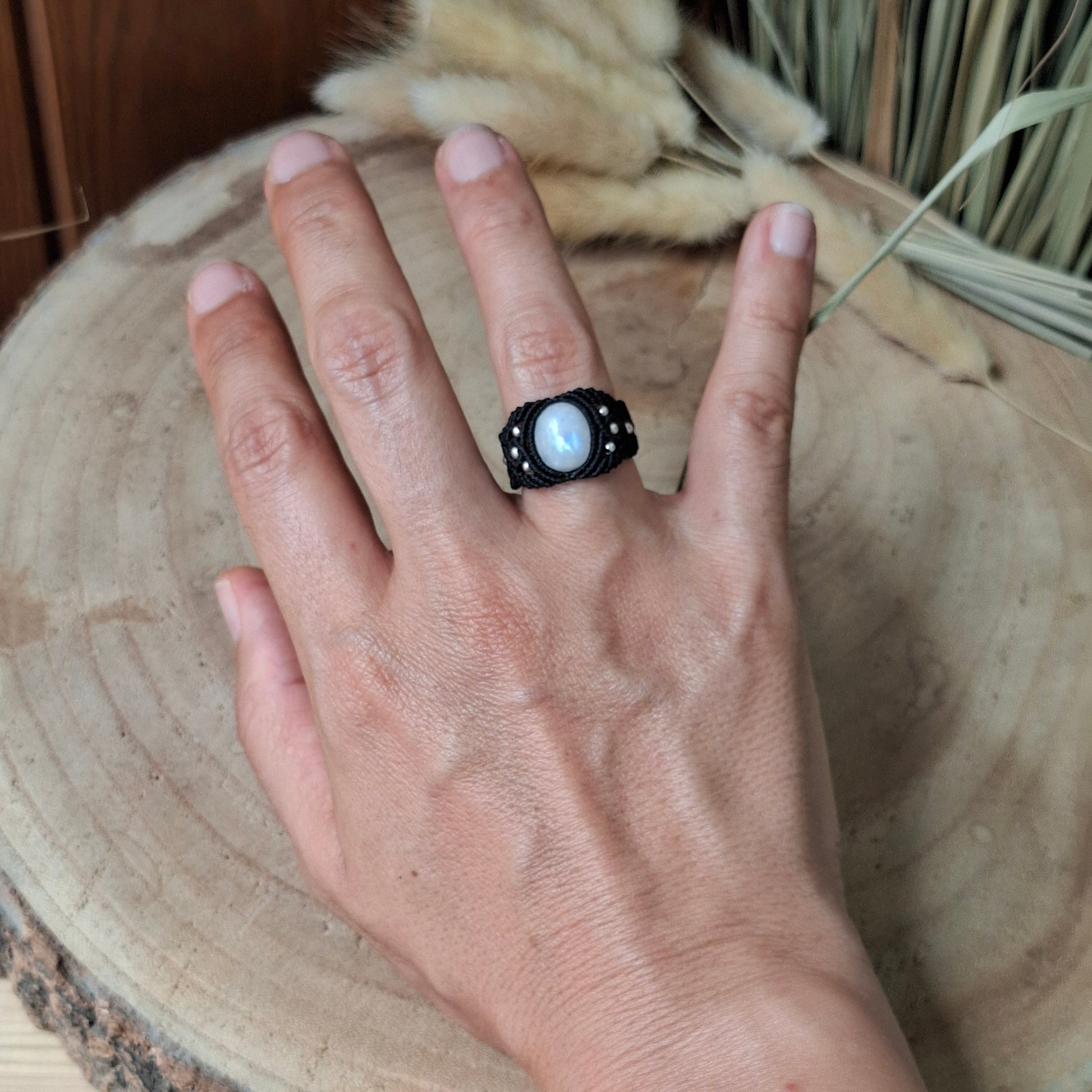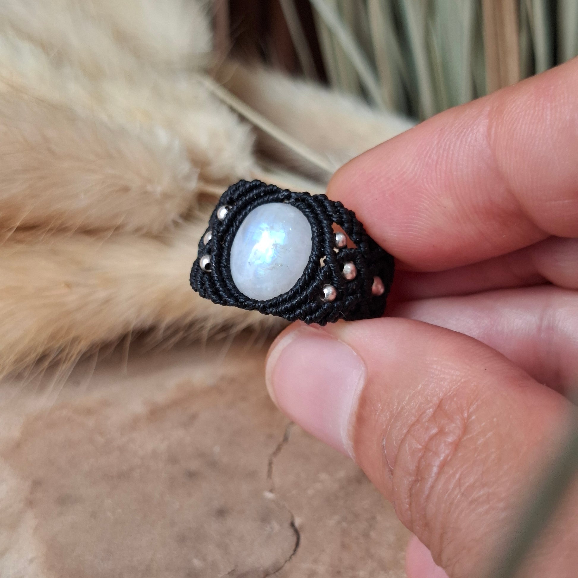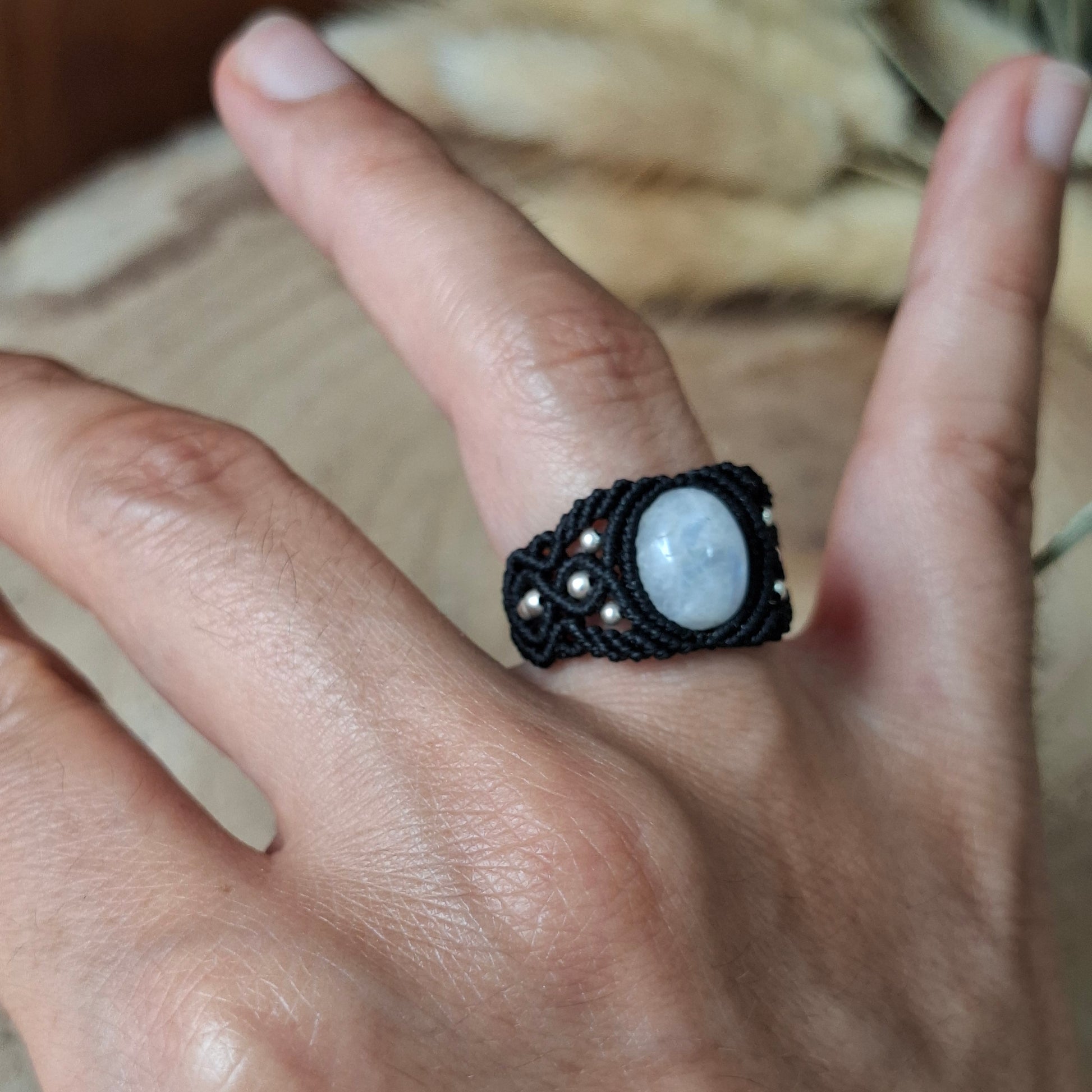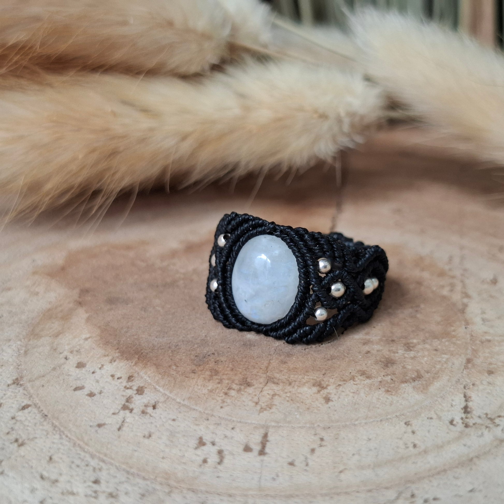 - Anillo de macramé trenzado a mano con hilo encerado de primera calidad, color negro.
