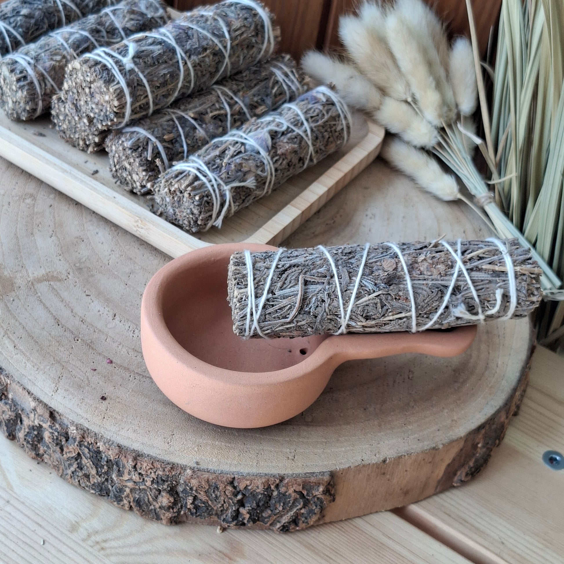 Cuando el atadillo se haya quemado, colócalo sobre una concha o un recipiente resistente al fuego hasta que se apague por completo. Puedes usarlo en varias sesiones, asegurándote de que siempre esté bien apagado antes de guardarlo.