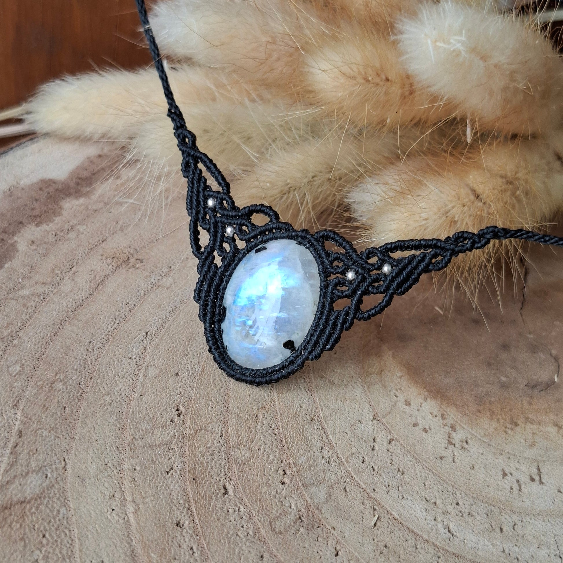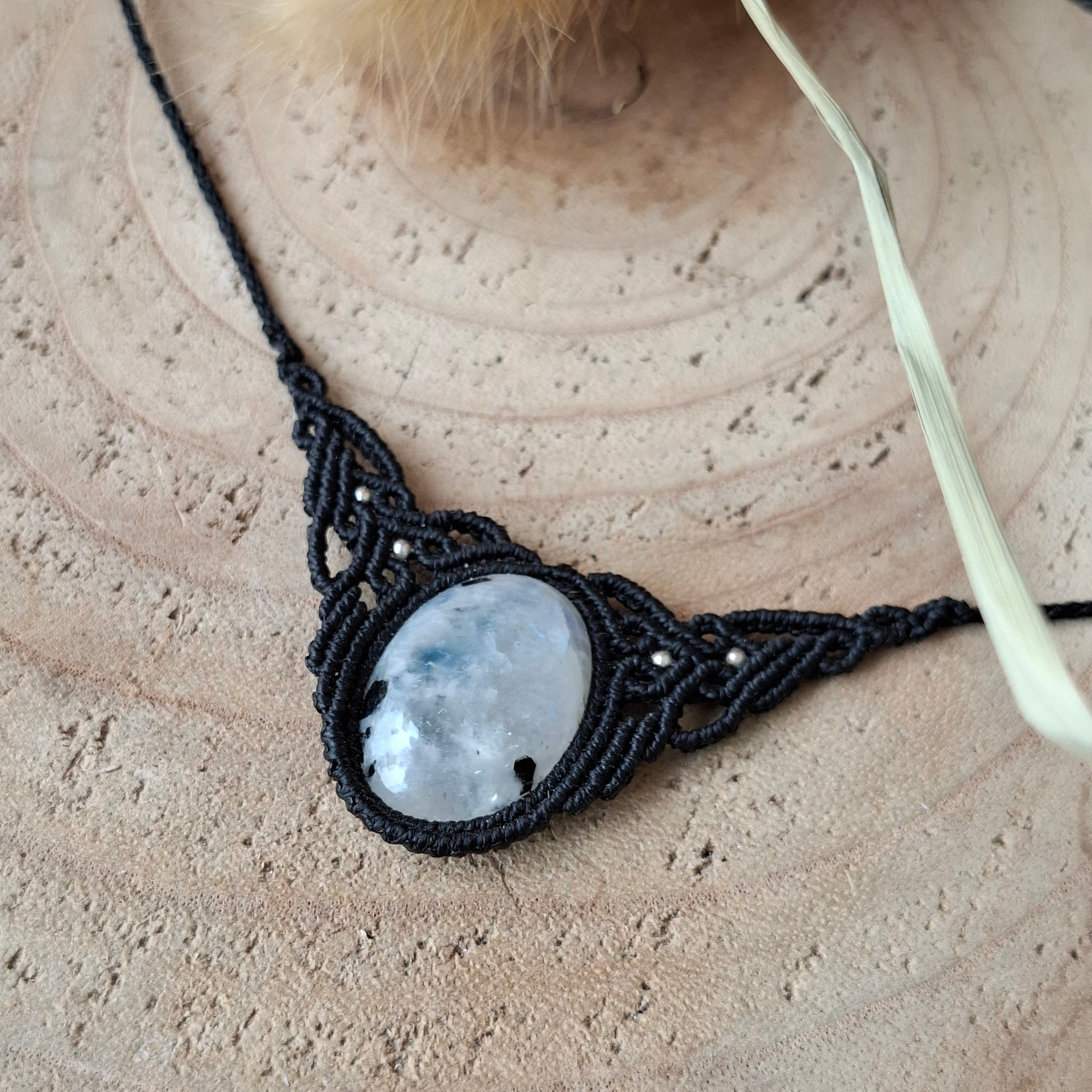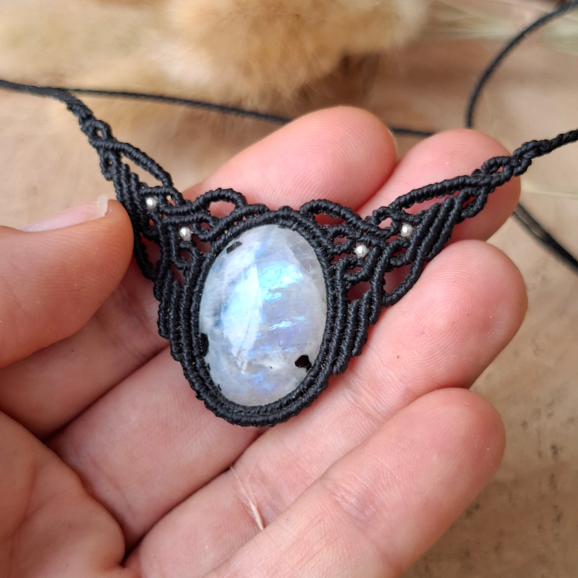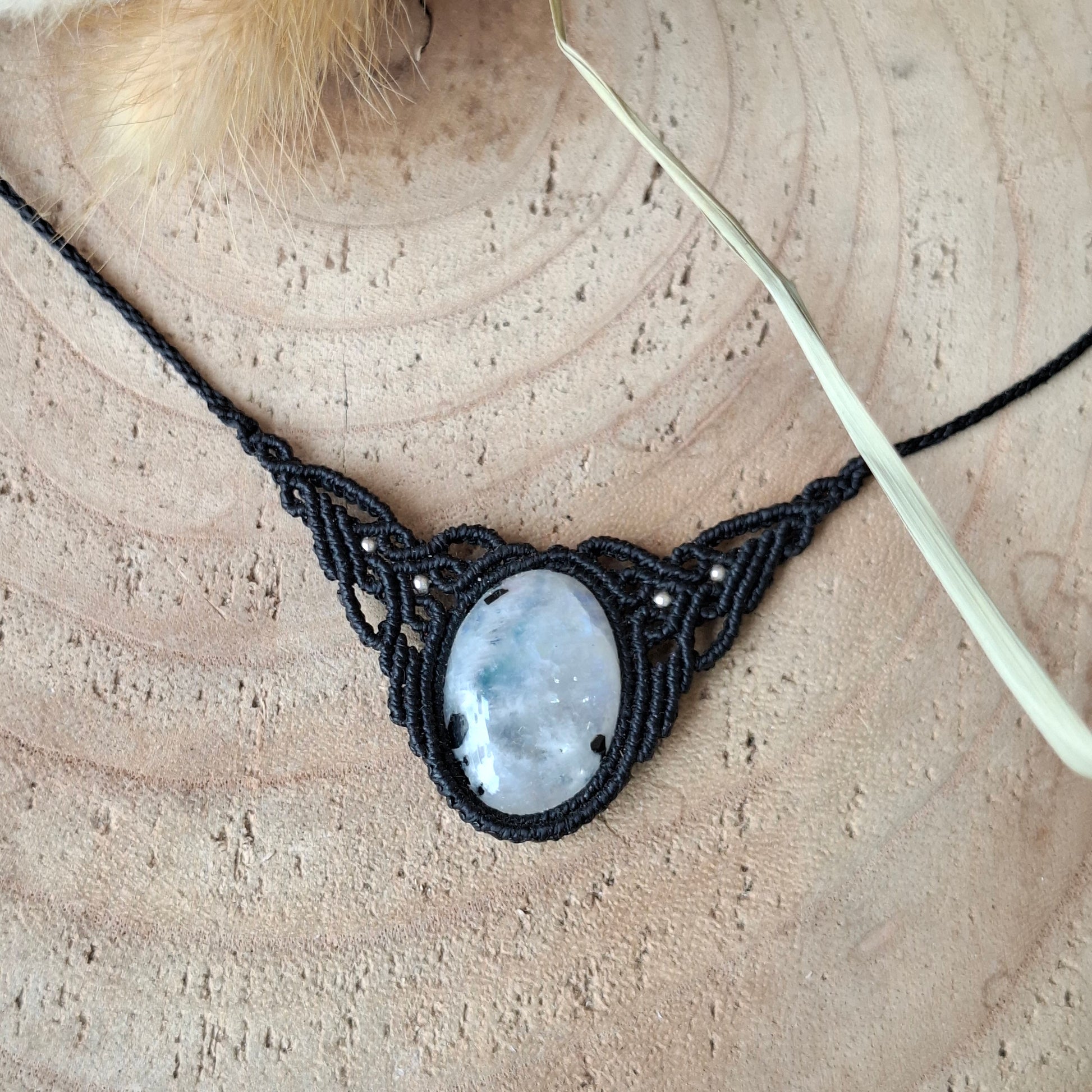 - Con una espectacular piedra luna arcoíris con incrustaciones de turmalina negra.