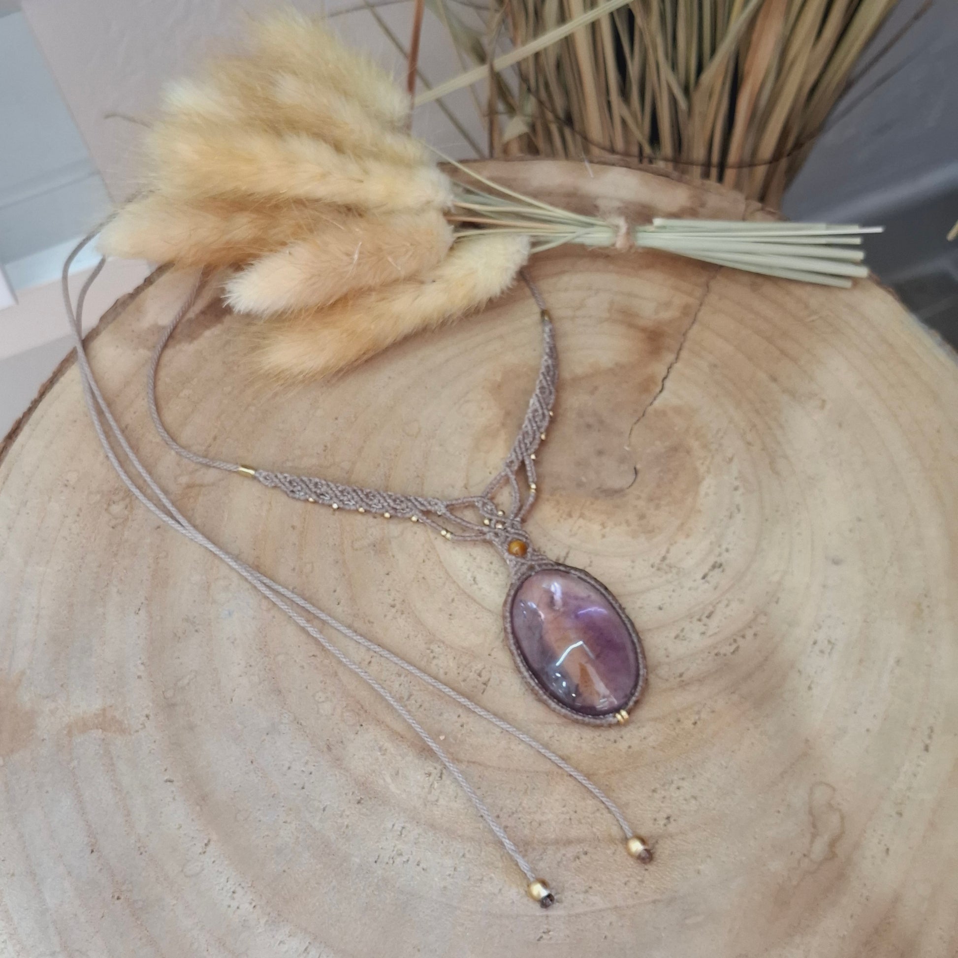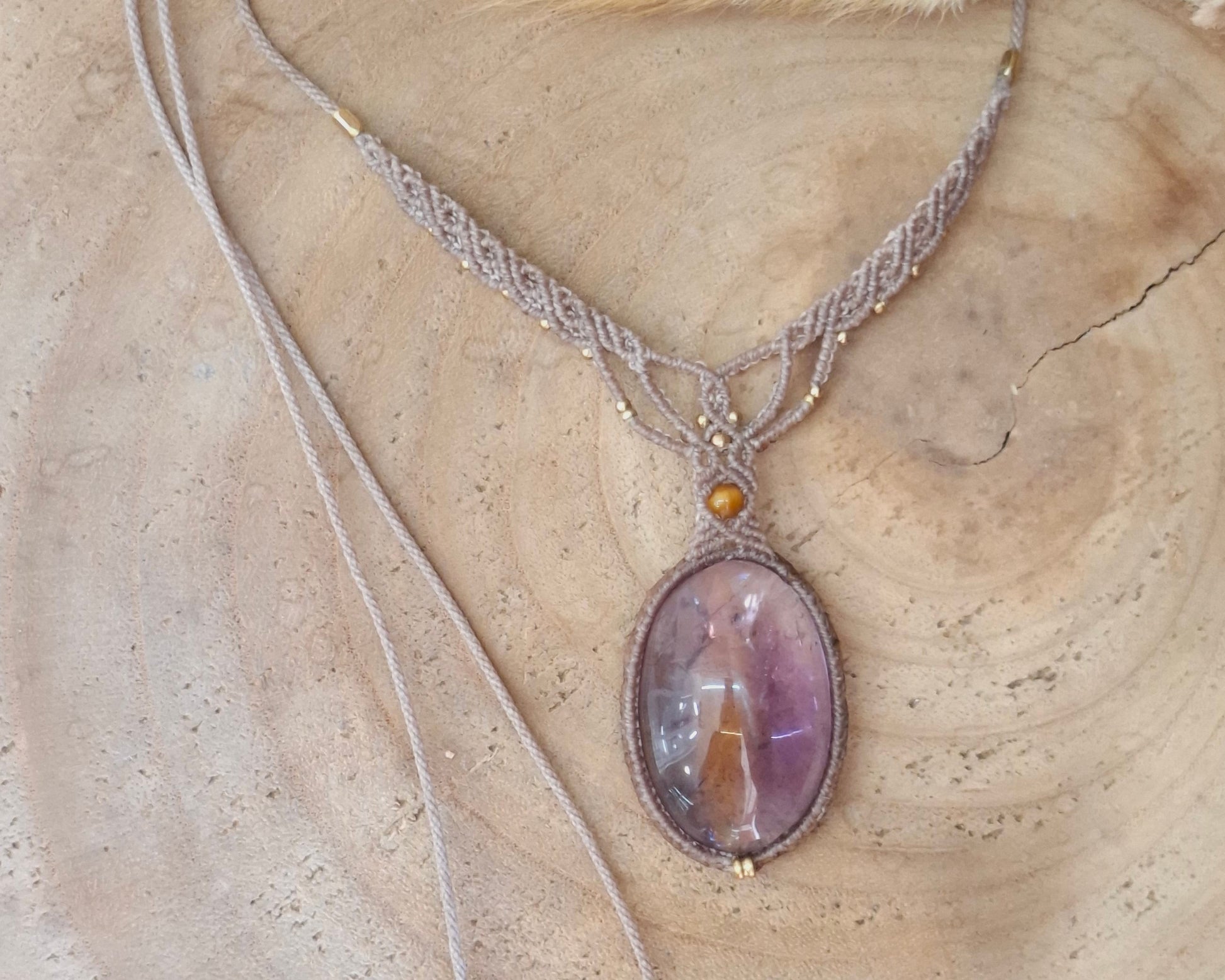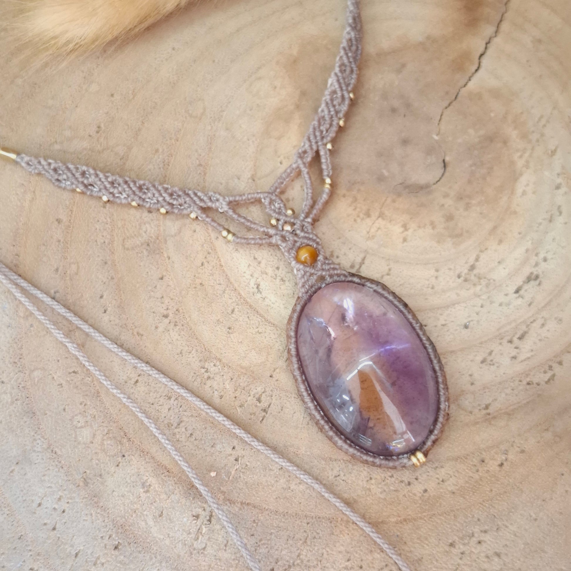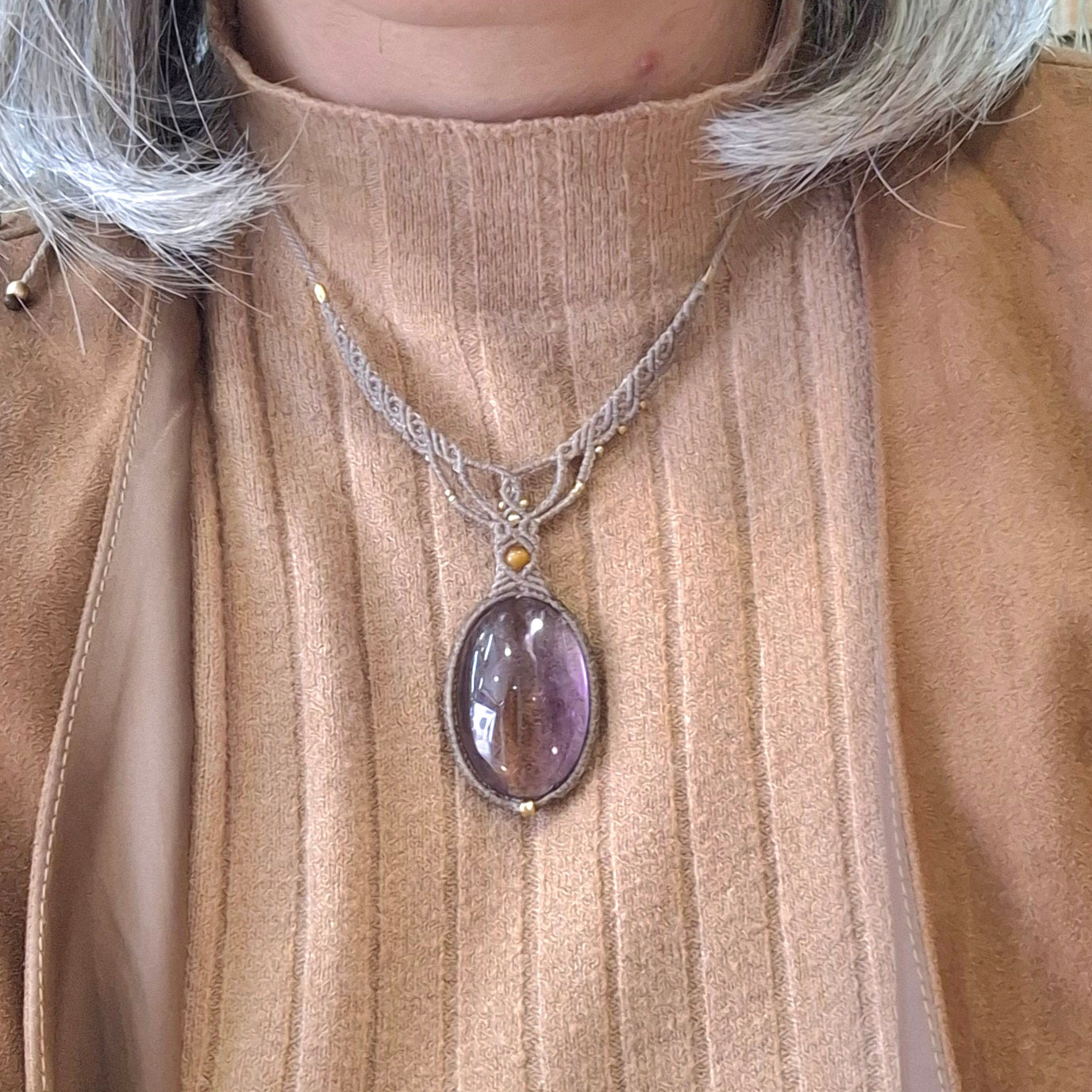 - Collar con un espectacular ametrino, de casi 4cm de largo, trenzado a mano con hilo encerado de primera calidad, de 0,5mm, color beige.