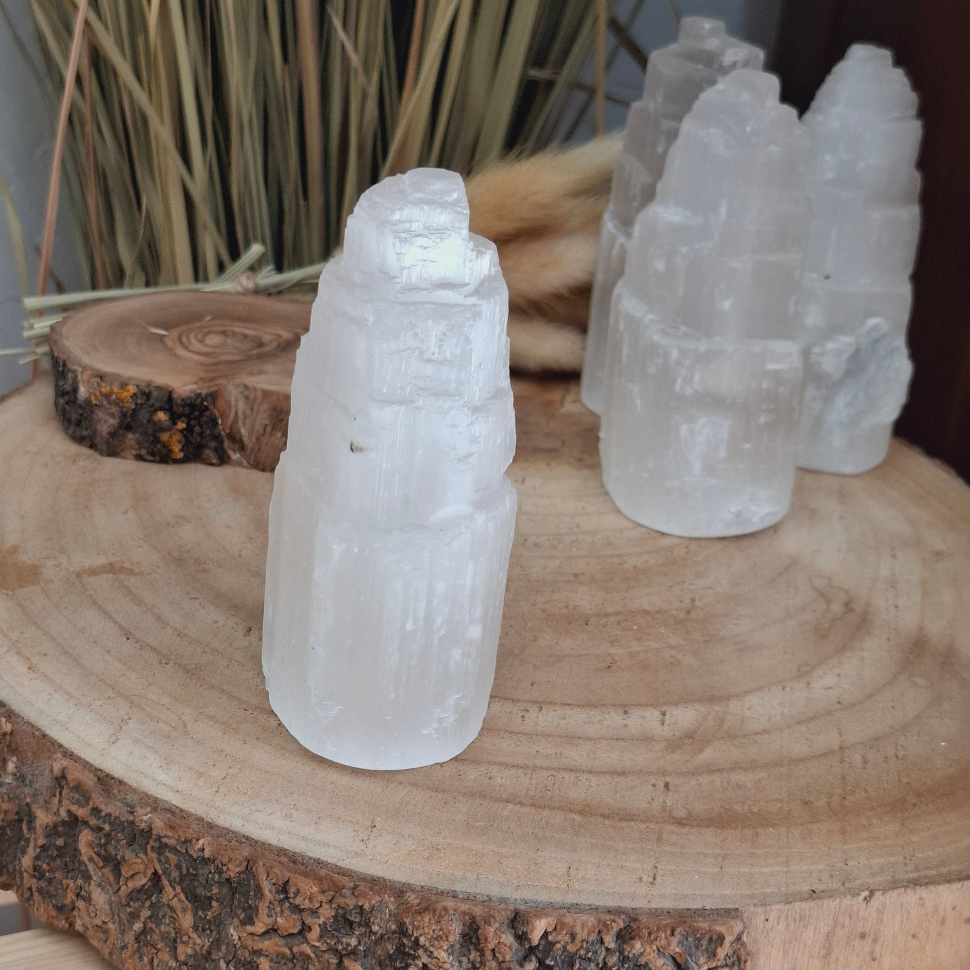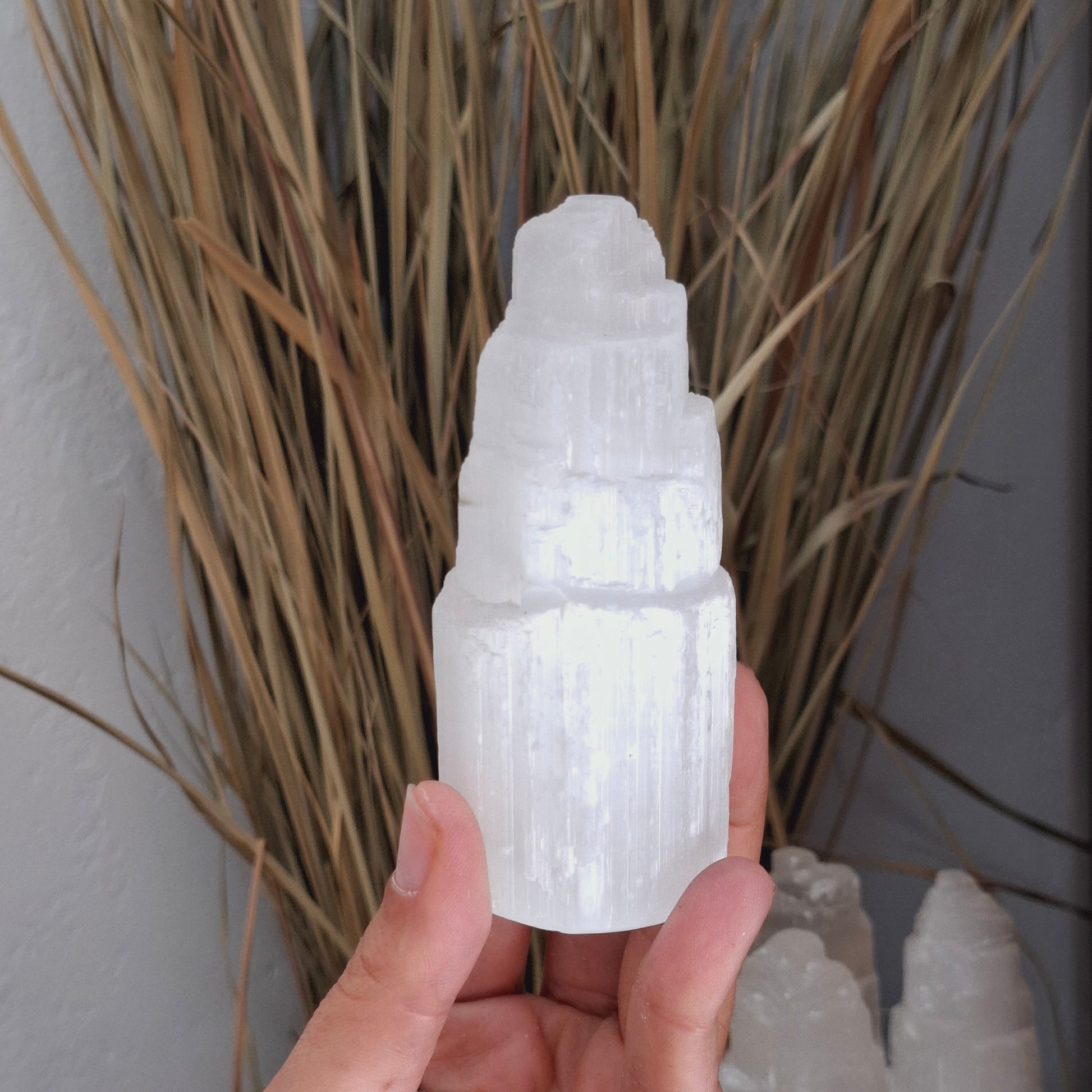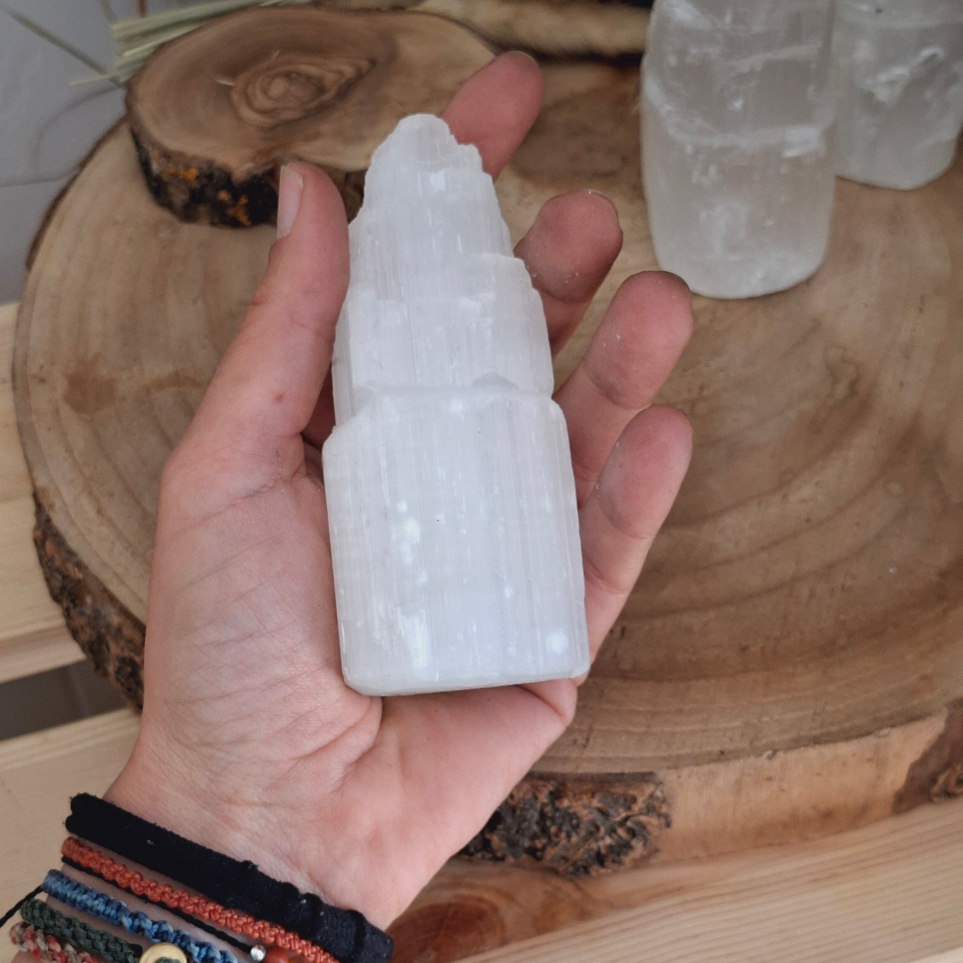 La selenita simboliza la pureza espiritual. Infunde paz profunda y se recomienda para la meditación. Se considera una piedra para la expansión de la consciencia y para activar los centros de energía superiores, como el chakra de la corona. La selenita ayuda a calmar la mente y favorece la claridad y la lucidez.