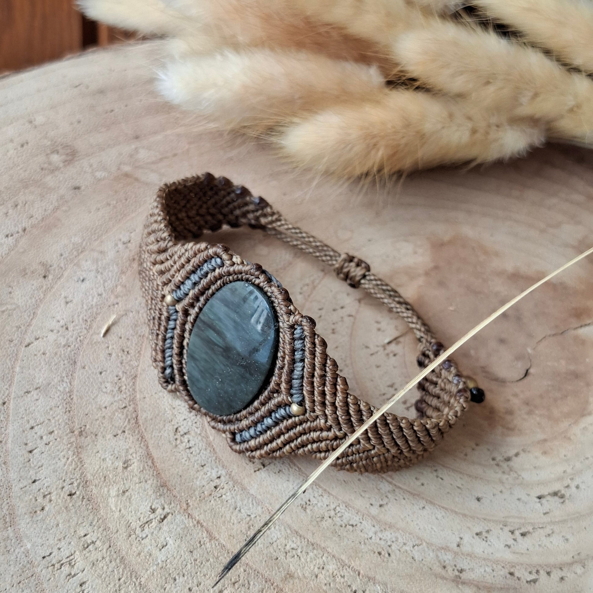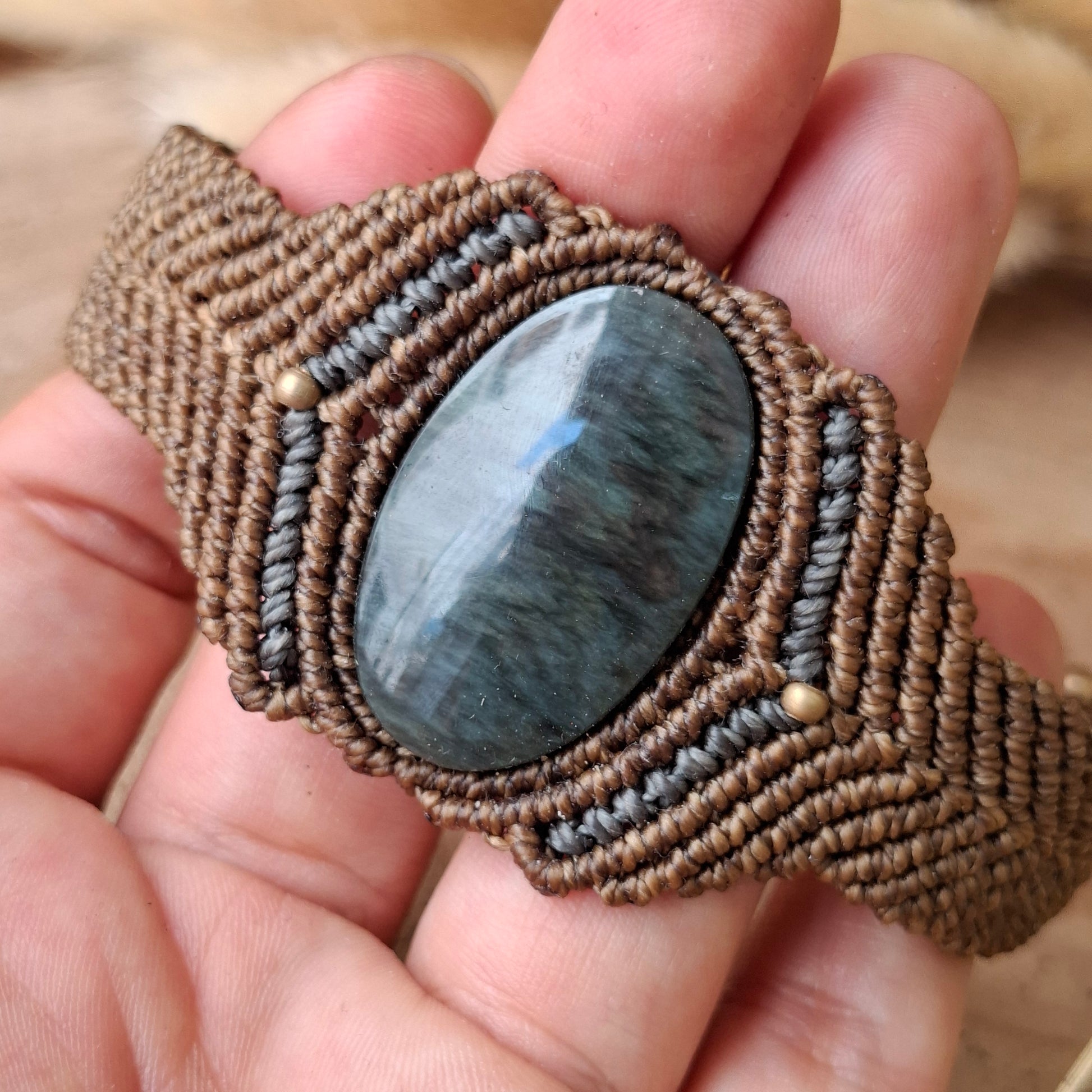 - Trenzada a mano con hilo encerado de primera calidad, grosor de 1mm, color ocre con detalle verde militar.
