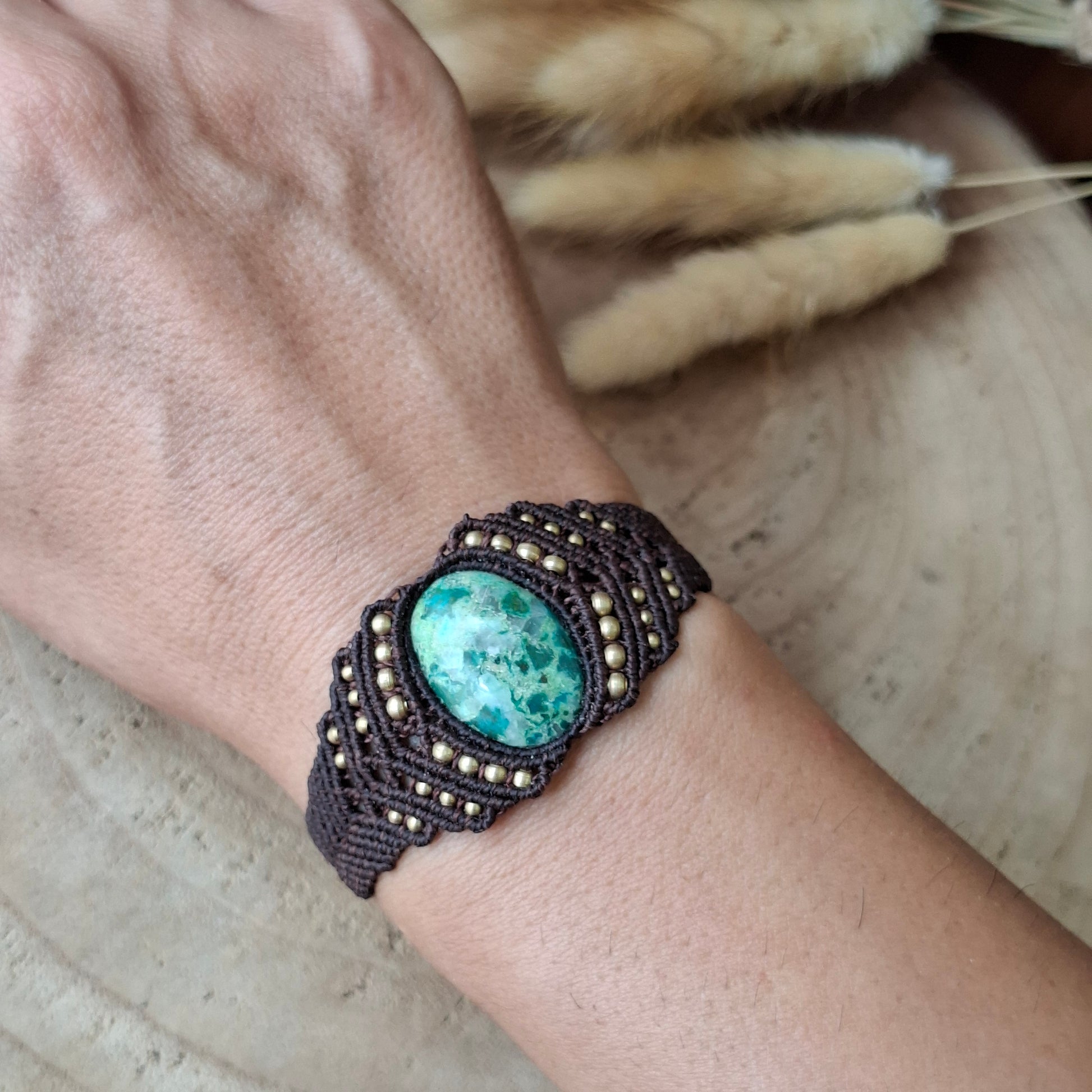 Las joyas hechas en macramé están elaboradas de hilo encerado de poliéster de alta calidad. Aunque el hilo es resistente al agua, recomiendo retirarse la joya para ducharse o para bañarse en la playa o en la piscina. El agua de la piscina contiene cloro y otros elementos químicos que podrían dañar el hilo, los elementos que decoran la pieza y el mineral en sí. Mientras no se use la joya, guarda tu joya en la bolsa de algodón que la contiene y en un lugar donde la temperatura ni la luz directa le pueda afectar de forma continua. Las joyas que pueden tener pequeños elementos decorativos como cuentas de latón y plata, puedes recuperar su brillo fácilmente frotando suavemente con una gamuza limpia metales.