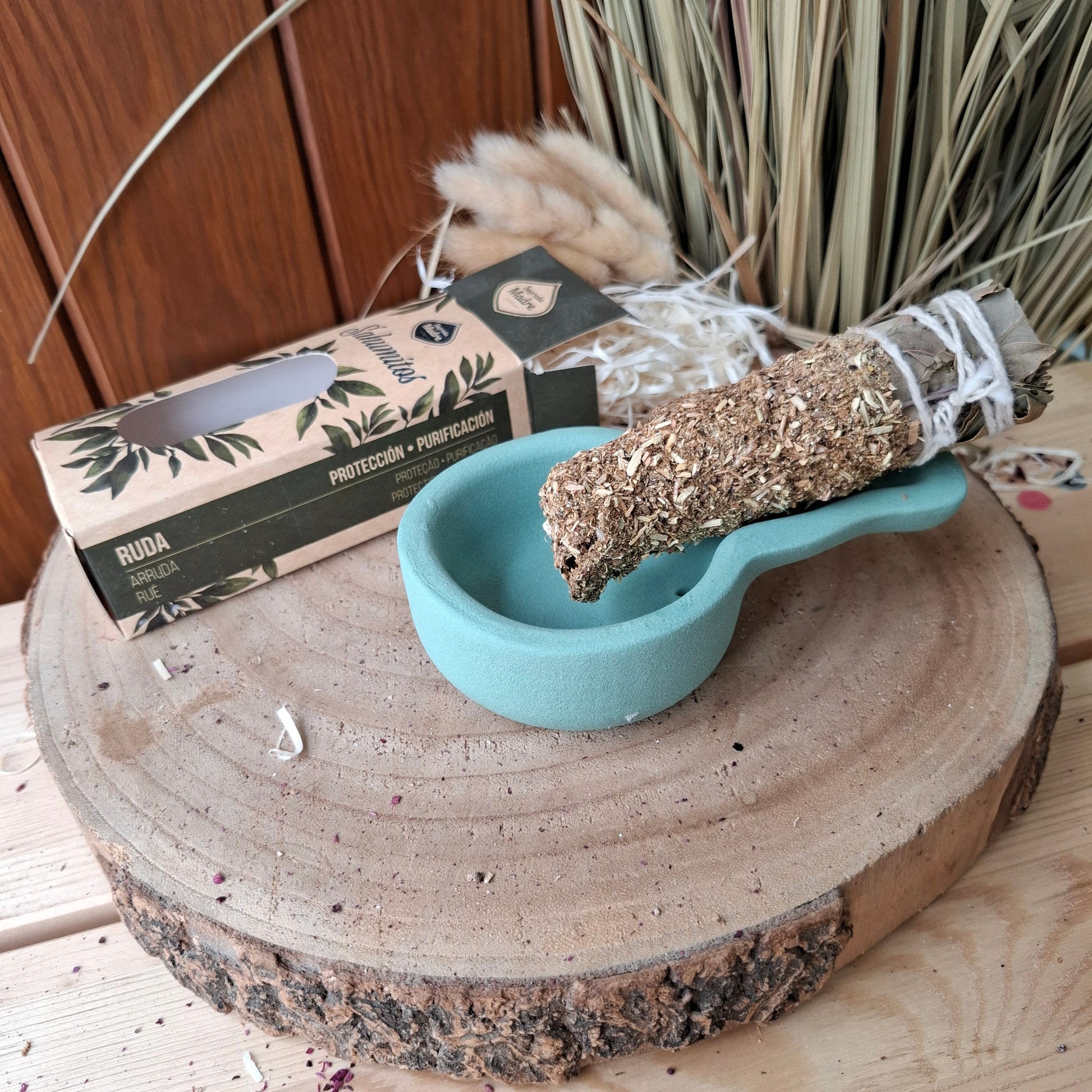 Cuando el atadillo se haya quemado, colócalo sobre una concha o un recipiente resistente al fuego hasta que se apague por completo. Puedes usarlo en varias sesiones, asegurándote de que siempre esté bien apagado antes de guardarlo.