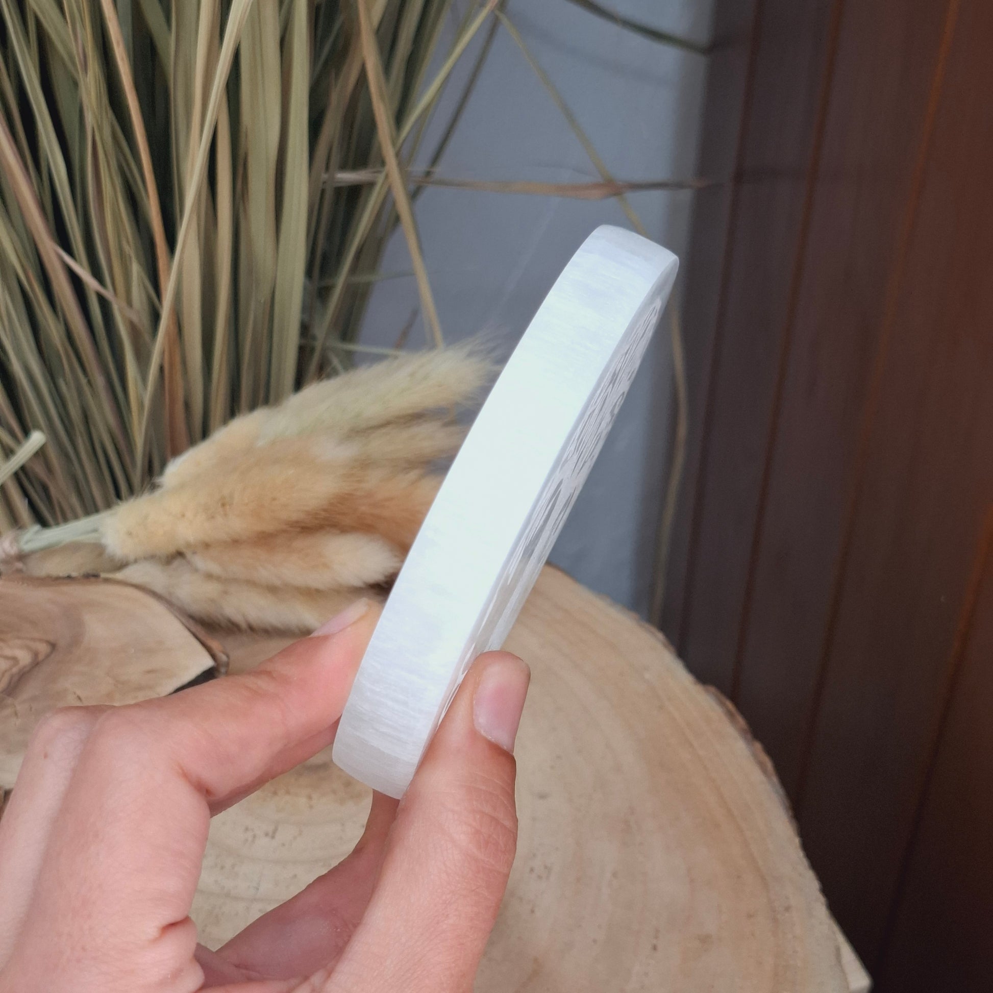 Placa de selenita de 10 cm de diámetro x 1,3 cm de grosor aproximadamente.